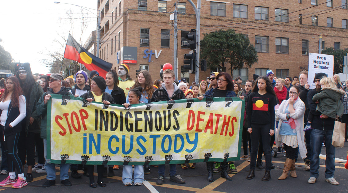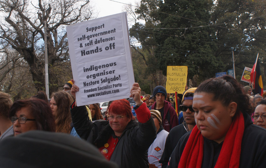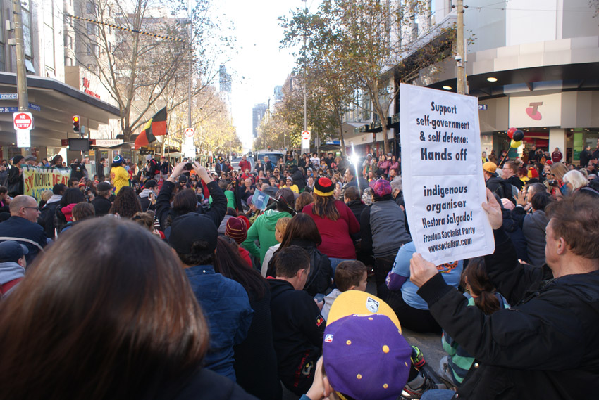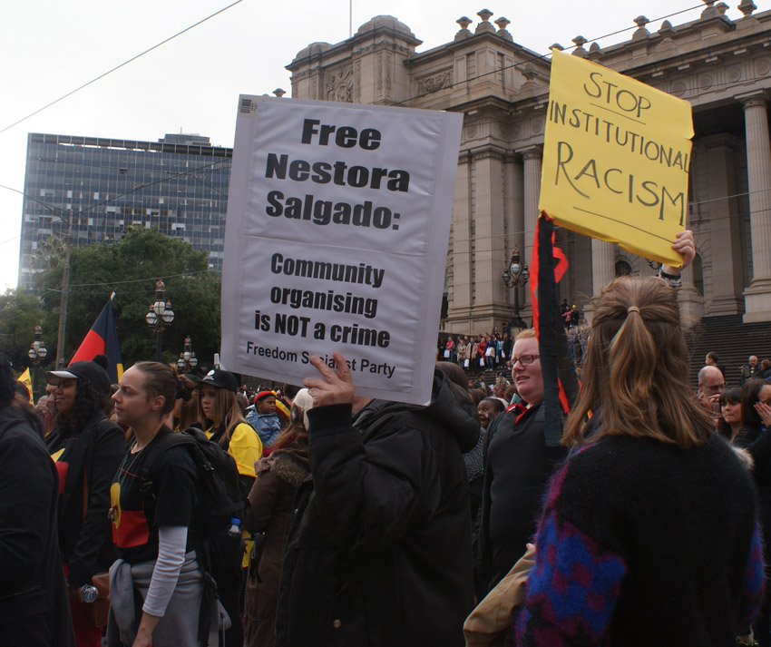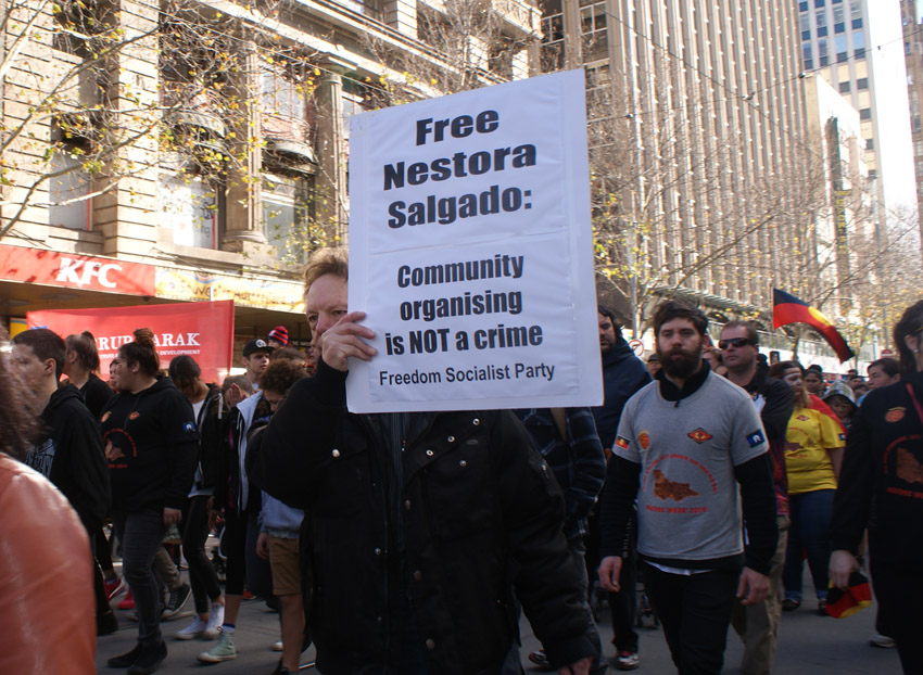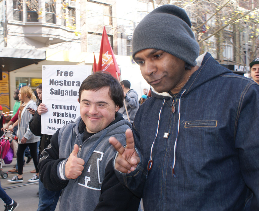 Supporters of the campaign to free Nestora Salgado in Australia participated in the annual NAIDOC march in Melbourne, 11 July 2014. NAIDOC Week celebrates the history, culture and achievements of Aboriginal and Torres Strait Islander peoples. For information abut the history of NAIDOC see: http://www.goingrank.com.au/naidoc.html