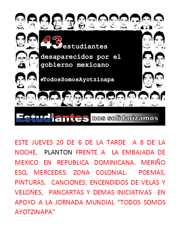 Call to demonstrate on November 20th at Mexican embassy in Santo Domingo, Dominican Republic Posted on November 18, 2014 by freedomsocialistparty Share this: Click to share on X (Opens in new window) X Click to share on Facebook (Opens in new window) Facebook Like Loading... Related