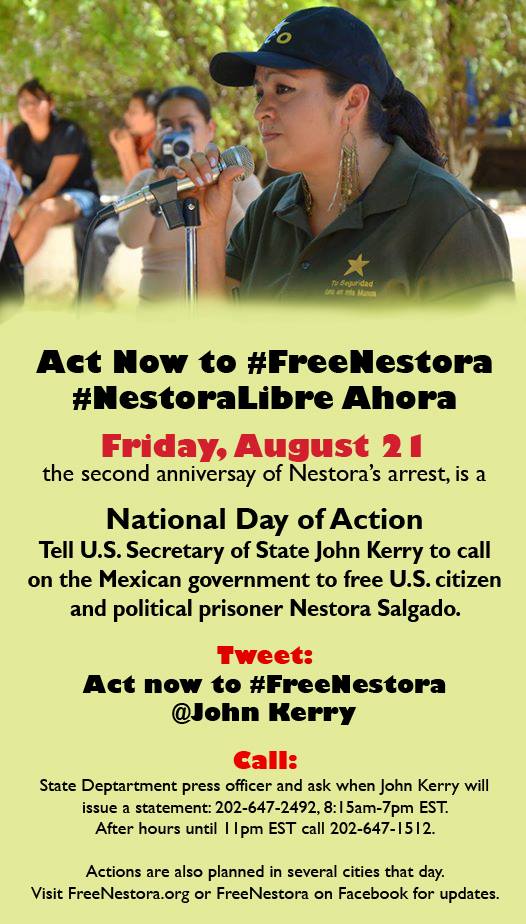 On August 21st, tell U.S. Secretary of State John Kerry to call on the Mexican government to release U.S. citizen and political prisoner Nestora Salgado.